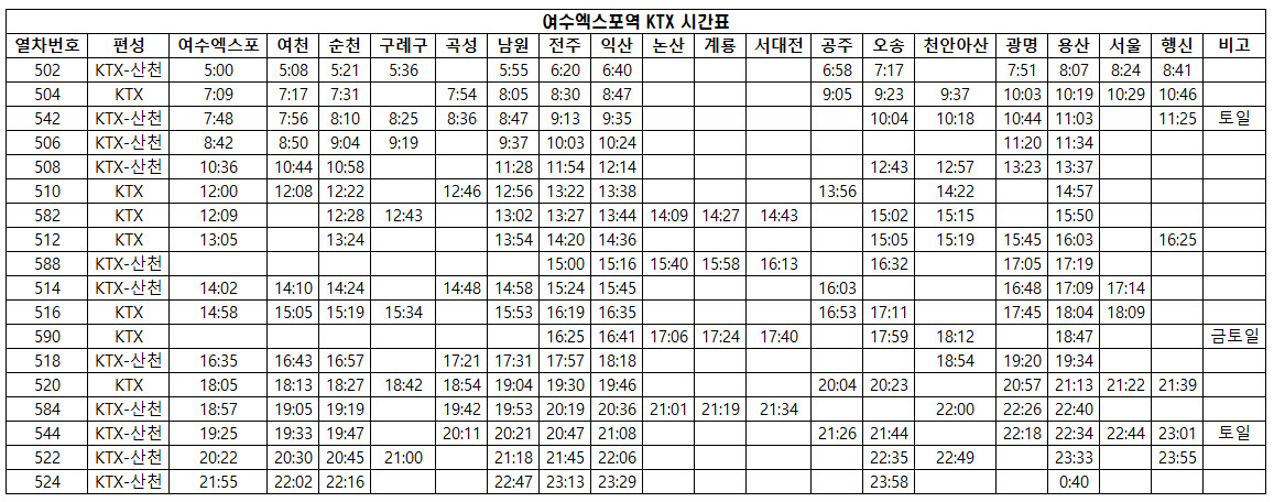 여수엑스포역 KTX 시간표를 다음과 같이 정리하여 알려드립니다.
